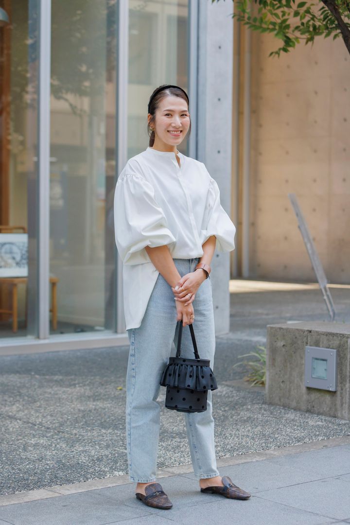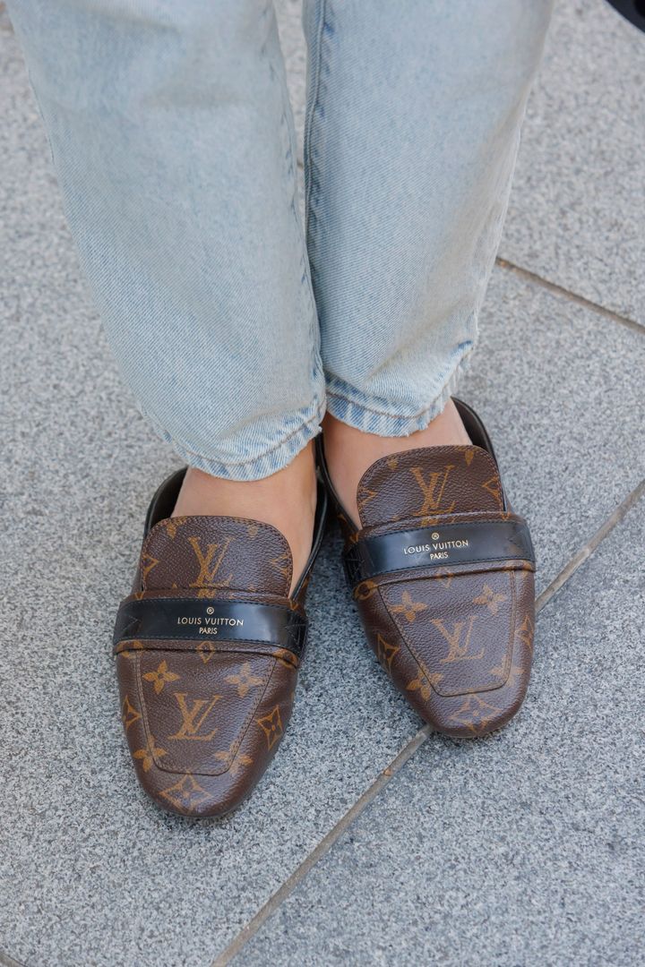 「ヴィトンのロゴが効いているので、服がシンプルな日のワンポイントとして活躍します。特にデニムとの相性がよく、脱ぎ履きがラクなところもヘビロテの理由です」祥代さん・164㎝(アパレル勤務/9歳の女の子と7歳の男の子ママ)