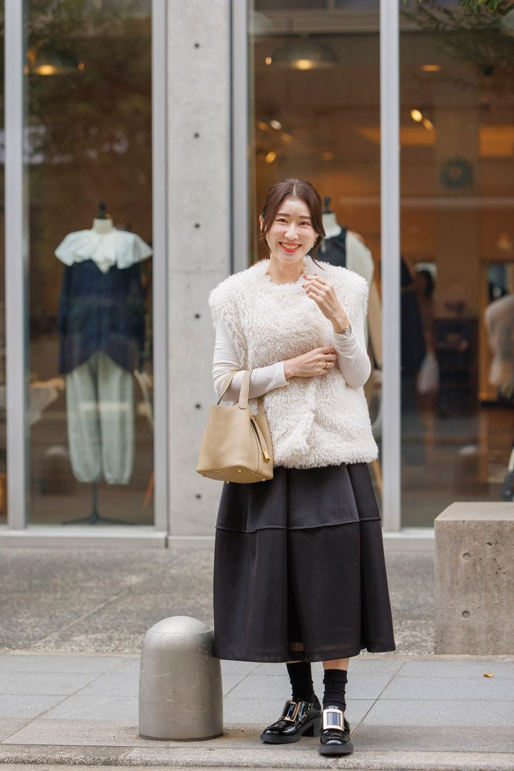「ロジェの厚底ローファーはビジューが付いていて、キレイめスタイルにもマッチするところがお気に入り。バランスが取りにくいボリュームスカートもこの靴を合わせればまとまります」大矢朋子さん・158㎝(主婦/4歳の女の子ママ)