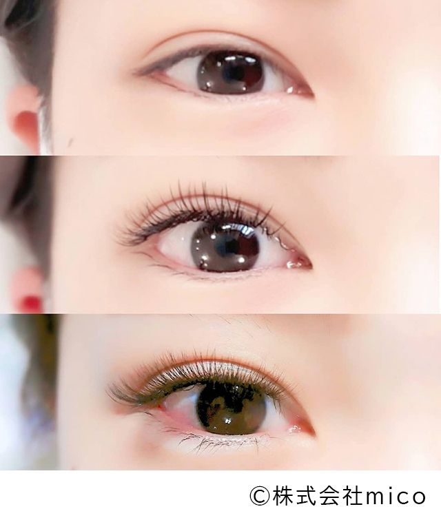 上から素の状態、長いエクステ、目尻を長く密度を上げたエクステを付けた状態となっています。