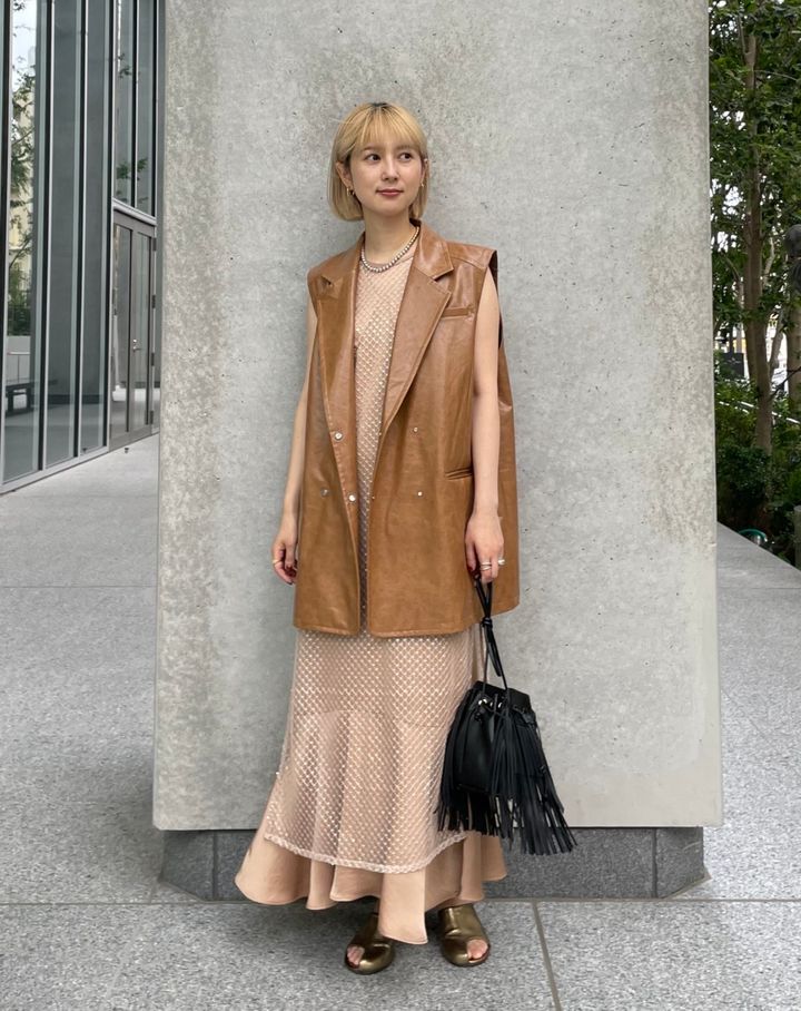 「ブラウンベージュのワントーンコーデがポイント。キレイめなレイヤードドレスに、あえて少しハードな印象のレザーベストを合わせて異テイストMIXに。正装とまではいかないけれど、きちんと感を出したいシチュエーションをイメージしたドレススタイルです」