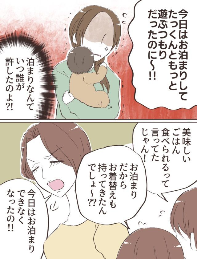 「ケチなのね~。その神経質さたっくんに影響するわよ?」と義姉に言われカチン!ときたマリコさん、「じゃあ、お義母さんも呼んでお義姉さんの様子を見ていただきましょう」と伝えると怒って「もうみんな帰るよっ!!」と言う義姉に子ども達が「今日はお泊まりだって言ったじゃん~!」と・・