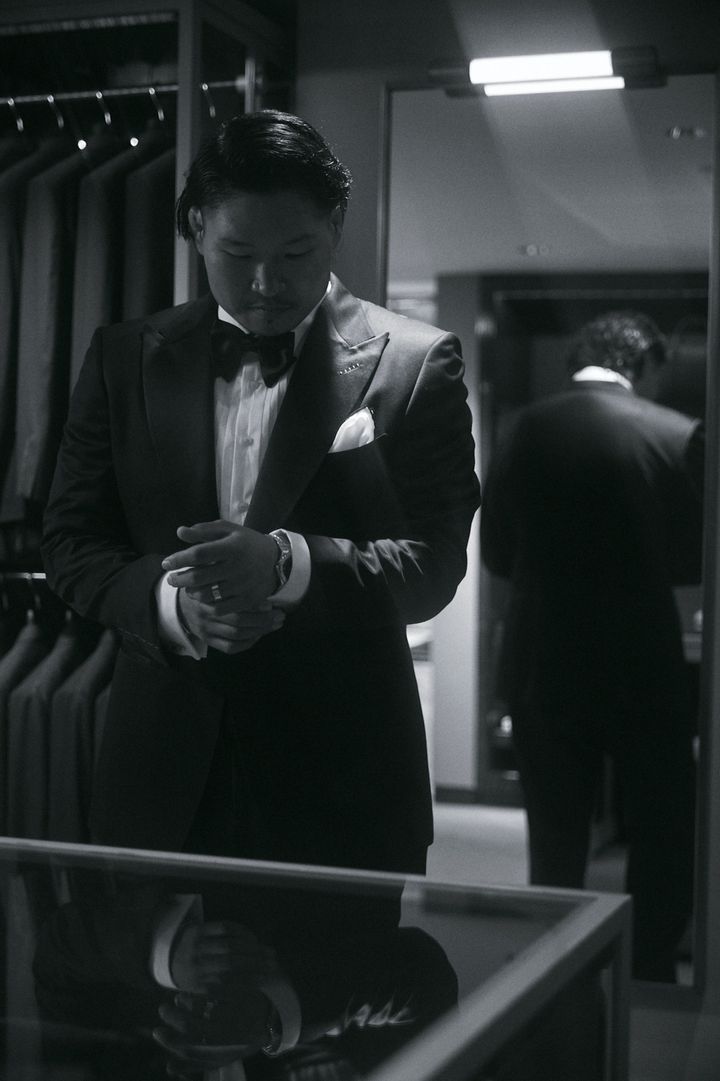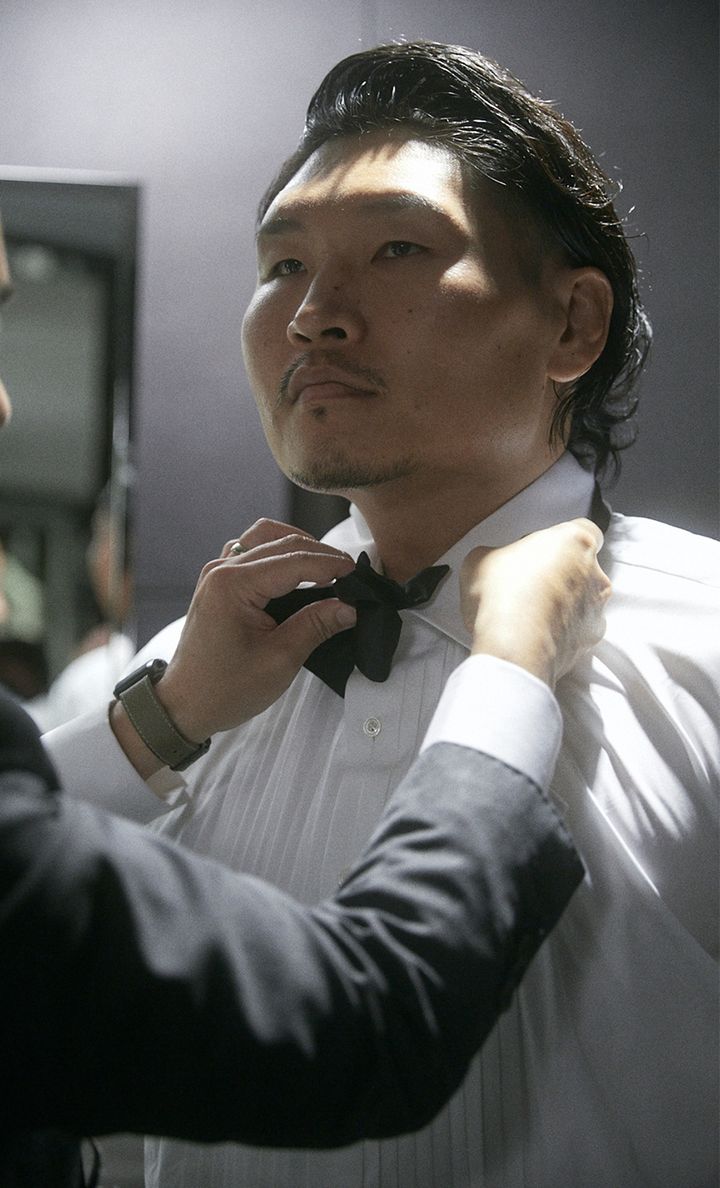 「華やかな場なので明るい色で遊びを効かせることも考えました。ですが、初めてトム フォードでオーダーメイドするタキシードであり、一生思い出に残る舞台だからこそブランドのクラシックさと自分のスタイルを組み合わせていこうと思い、深い色を選びました」