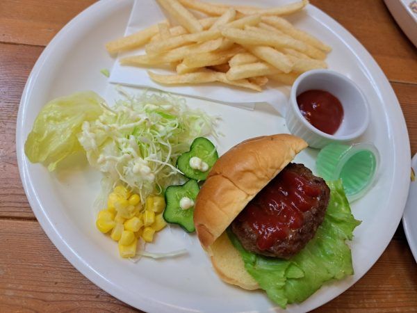 かわいいクマの絵が描かれている唐揚げプレートと、キッズバーガープレートを注文。 キッズドリンクも50円で付けれて、お財布にも嬉しい!