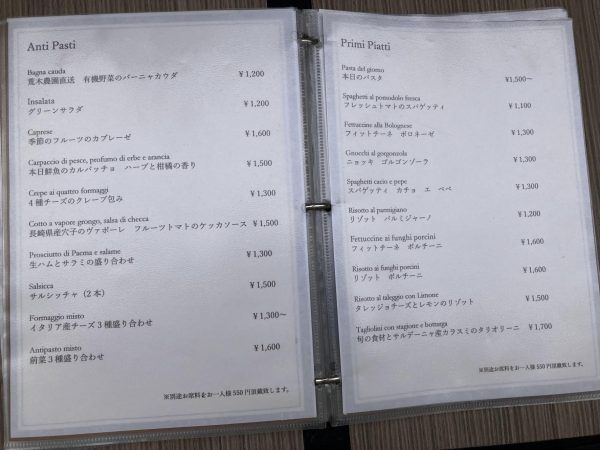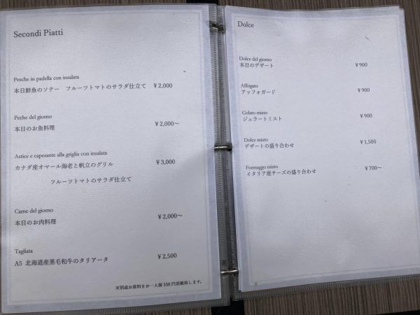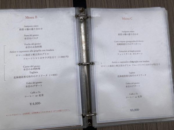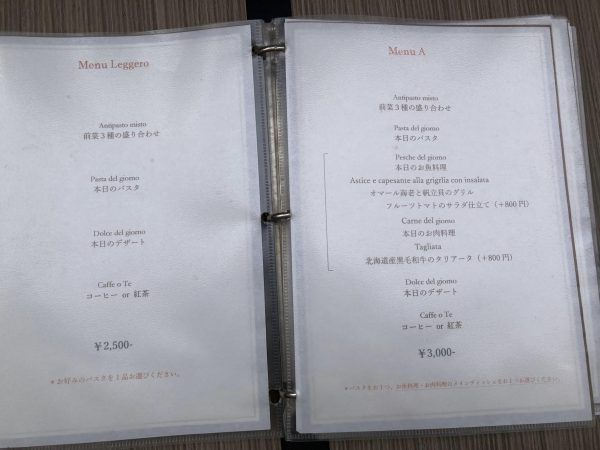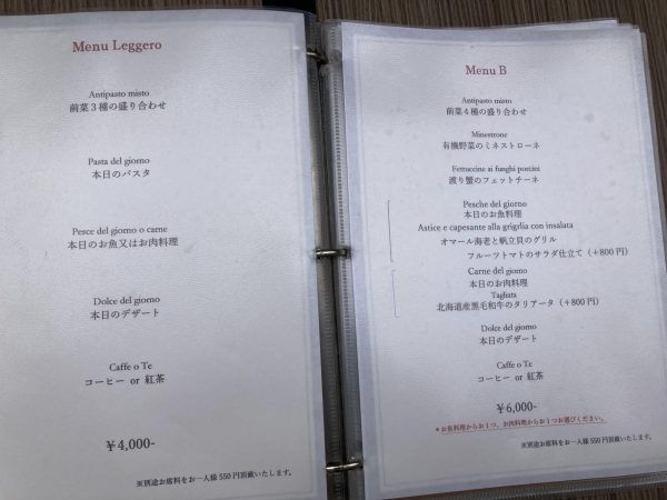 ランチはパスタがメインのお手軽なシンプルなコースとその他に3種、ディナーは2種のコースがあります。