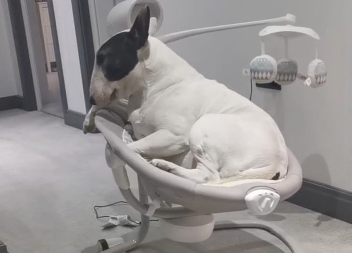 3. 「赤ちゃんが見ていないうちに!」電動ゆりかごで遊ぶ犬さん。
