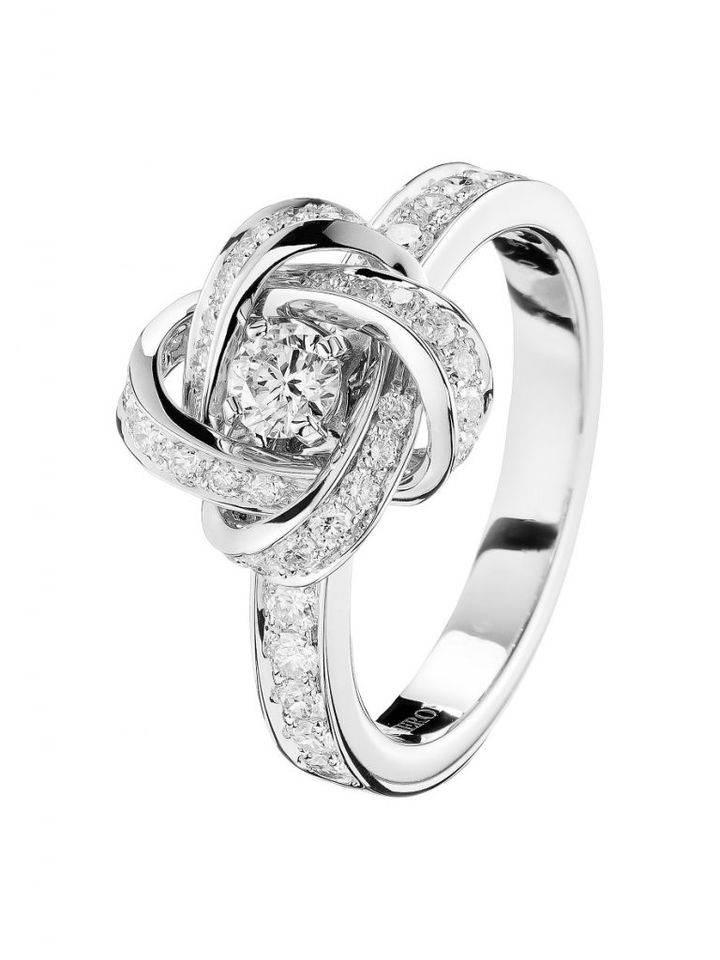 繊細なゴールド細工の技術によって生み出せる、立体的でボリューム感のあるデザインが特徴。洗練された芍薬の花をモチーフには愛し合うふたりをつなぐ結び目が表現されています。さらに花びらを模したデザインと中央でまばゆく輝くダイヤモンドは、手元でぱっと花が咲いたような華やかで可憐な表情を演出してくれます。