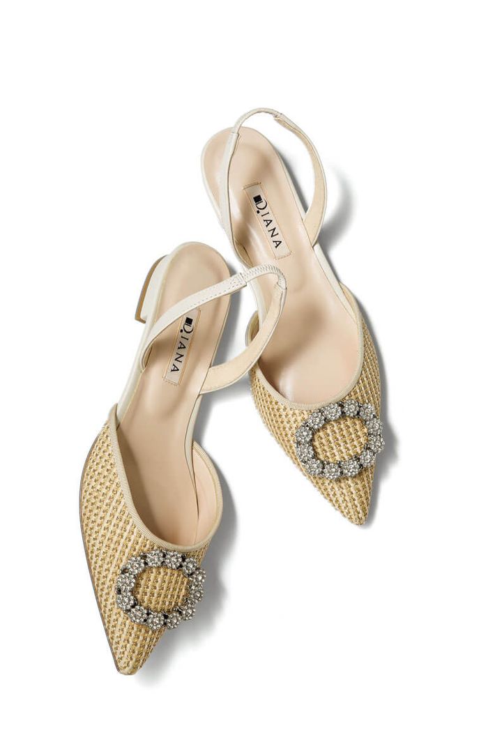 おなじみビジュー付きサンダルを夏素材で旬顔にアップデート。ポインテッドトゥで美しいシルエットに。