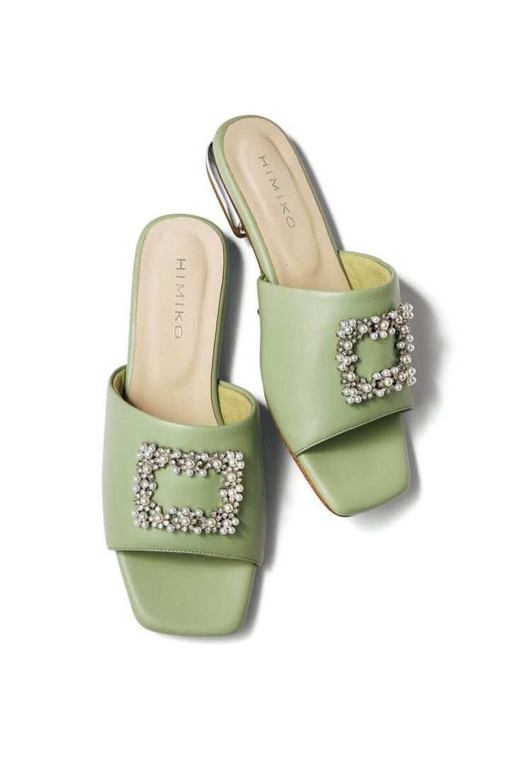 ダスティーなグリーン×ビジューでかたどったスクエアバックルでフェミニンに。