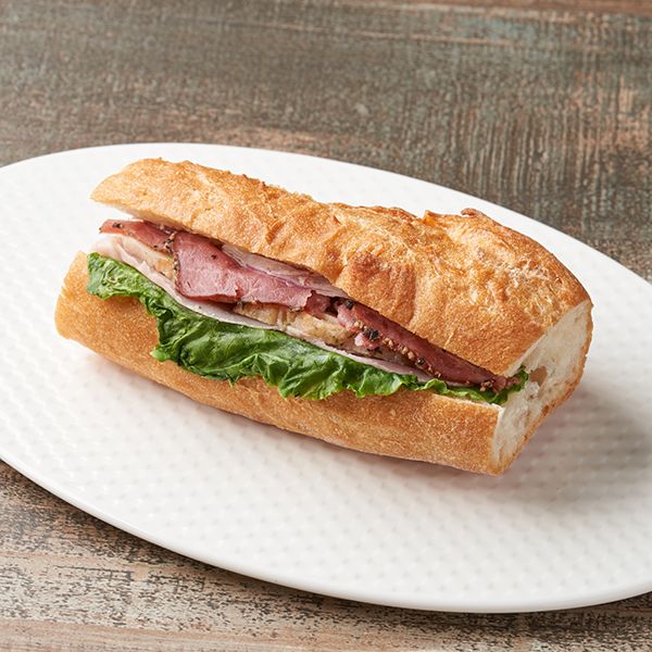 石窯で焼いたパリジャンに、ポークハム、ローストチキン、パストラミビーフの3種類のお肉と、グリーンリーフ、レタス、ピクルスオニオンマヨソースを挟んだ贅沢感のあるサンドイッチです。