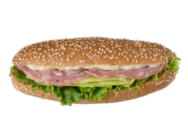 4種の雑穀が入った胡麻付きパンに、レタスや玉葱マリネを挟み、野菜の食感とソフトサラミの塩味がアクセントが特長のロールパンです。絶対おいしい!