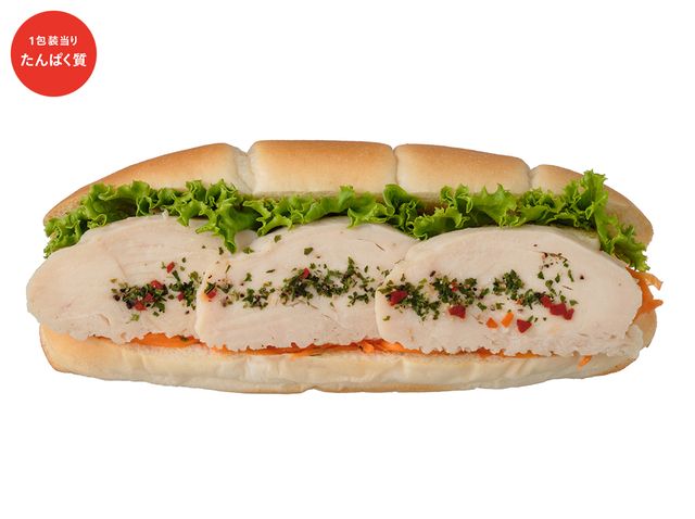 セミハードロールにサラダチキンと人参マリネを組みあわせ、ぷちぷち食感のマスタードがアクセントの食べ応えがある仕立てです。たんぱく質が摂れます!