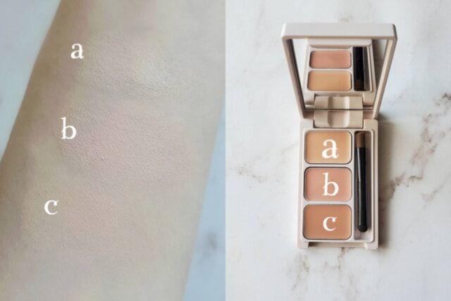 aは肌なじみのいい柔らかなテクスチャーなので、涙袋メイクや気になるポイントのお直しにぴったり。bは伸びのいいテクスチャーでやや赤みが入っているので、クマや色ムラのカバーに、そしてcは固めのテクスチャーになっているので濃いめにできてしまったニキビ跡のカバーにおすすめ。また、色混ぜができるので、自分にあった色に調整できるのも嬉しいポイントです。