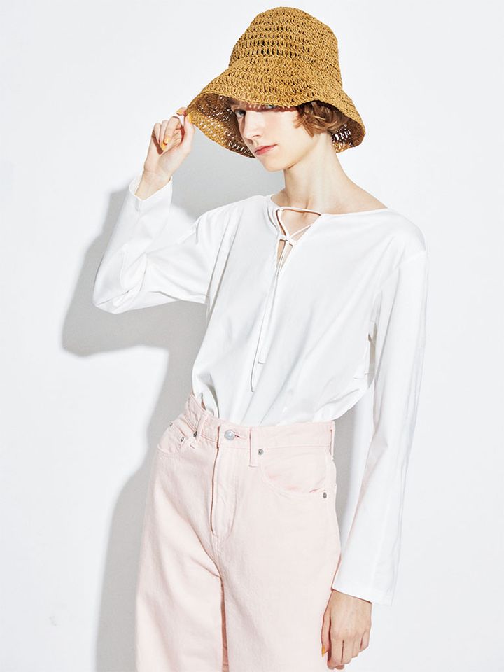 やわらかいけど適度にハリのあるペーパー素材だから、落ち着いたテンションで使えるバケットハット。長いけど広がりすぎないつばは、編み目の抜けのおかげで緊張感を気にせず小顔効果が期待できる。レザーやコットンよりも軽やかな素材感が、季節に見合ったさわやかさをデリバリー。