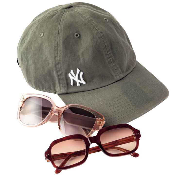 抱っこ紐の日は、おしゃれ心を託せるサングラスとキャップが定番。サングラスは顔周りが洒落て見えるカラーフレーム&カラーレンズがブームで、DIORとLexxolaがお気に入り。ニューエラのキャップは息子と夫、3人でリンクできて嬉しい!