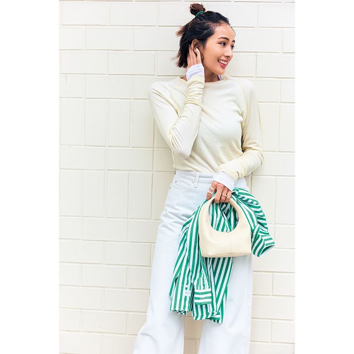 カットソー¥12,980中に着たカットソー¥9,900(ともにザ シンゾーン/シンゾーン ルミネ有楽町店)レギンス¥11,000(トゥー ユナイテッドアローズ/ユナイテッドアローズ渋谷スクランブルスクエア店)ピアス¥19,800(イリスフォーセブン/フーブス)バングル¥88,000(ヒロタカ/ヒロタカ 表参道ヒルズ)リング[薬指]¥165,000〜リング[小指]¥15,400(ともにアルティーダウード/THE ANOTHER MUSEUM)バッグ¥20,350(トゥデイフル/ライフズ 代官山店)スマホロープストラップ¥4,400スマホケース¥2,860(ともにトポロジー/トポロジー フラッグシップ ショップ)スニーカー¥15,400(アディダス/アディダスお客様窓口)