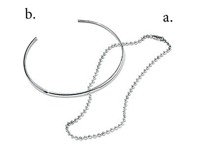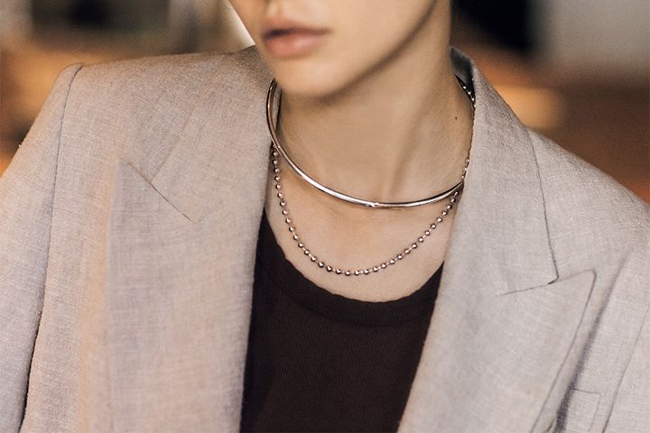 タンクトップにリネンジャケットを重ねたヘルシーな組み合わせ。あっさりとした印象を与えやすい首元の余白に、シルバーのチョーカーを。チョーカー1本でも成立するところ、ボールチェーンを足して強さをオン。