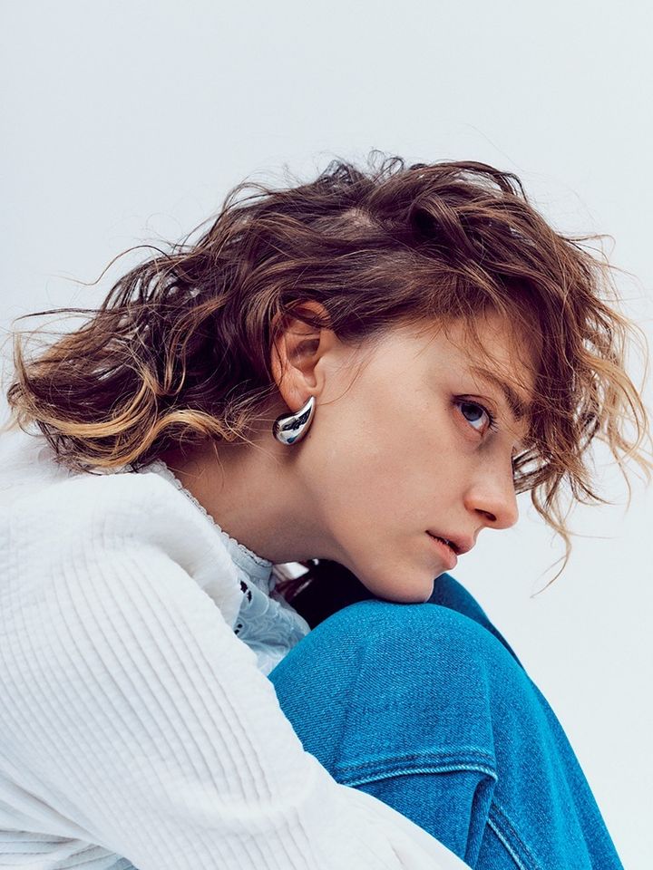 シルバーピアス 14,300円/ラブ・エージェイ(ZUTTOHOLIC) レースブラウス 23,000円/イエナ(イエナ ラ ブークル ニュウマン新宿店) デニムパンツはSTYLE02と同じ。 ややスミがかったシルバーの色みと、雨のしずくのようなぼってりとしたフォルム。耳元の存在感で、甘いはずのコットンレースがキリッとクールに見違える。