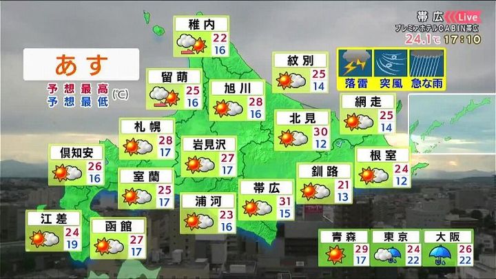各地で夏空が広がりますが、午後は峠や山沿いの一部で雷雨に注意してください。最低気温は今朝より5度前後高く、江差は19度。今夜は少し寝苦しくなりそうです。日中は広く真夏並みの暑さです。