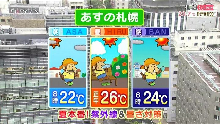 札幌や小樽など朝から晴れて、日ざしが強いでしょう。気温もグングン上がり、最高気温は25度前後。日陰を選んで歩くなど紫外線や暑さ対策が必要です。