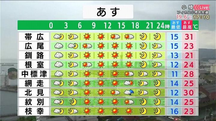 朝は羽幌など海岸部で曇りますが、昼頃からは旭川、岩見沢など各地で晴れます。朝の寒さは緩み、最低気温は15度くらい。日中は真夏の暑さです。