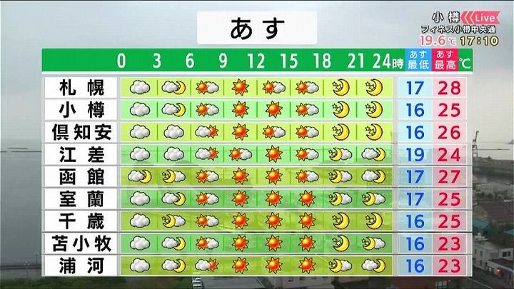 あすの時間ごとの天気、道央・道南からです。
