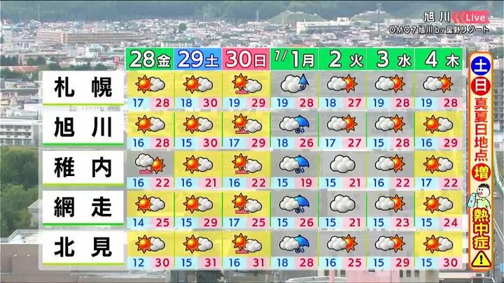 土日も晴れて、土曜日の最高気温は札幌や旭川で30度、北見は31度です。まだ暑さに慣れていない時期です。(こまめに水分や休憩をとるなど)熱中症対策をしてください。