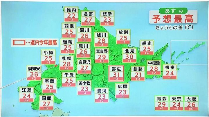 きょう27日(木)は一気に暑くなりました。あす28日(金)はさらに暑くなるところがあります。あすの最高気温は帯広で道内の今年最高となる31度まで上がります。札幌は28度、函館や室蘭、網走など海岸部でも夏日でしょう。