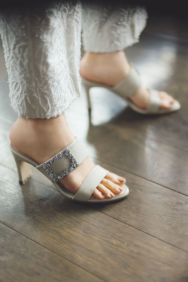 素足をのぞかせたヒールミュールで足元は軽やかに