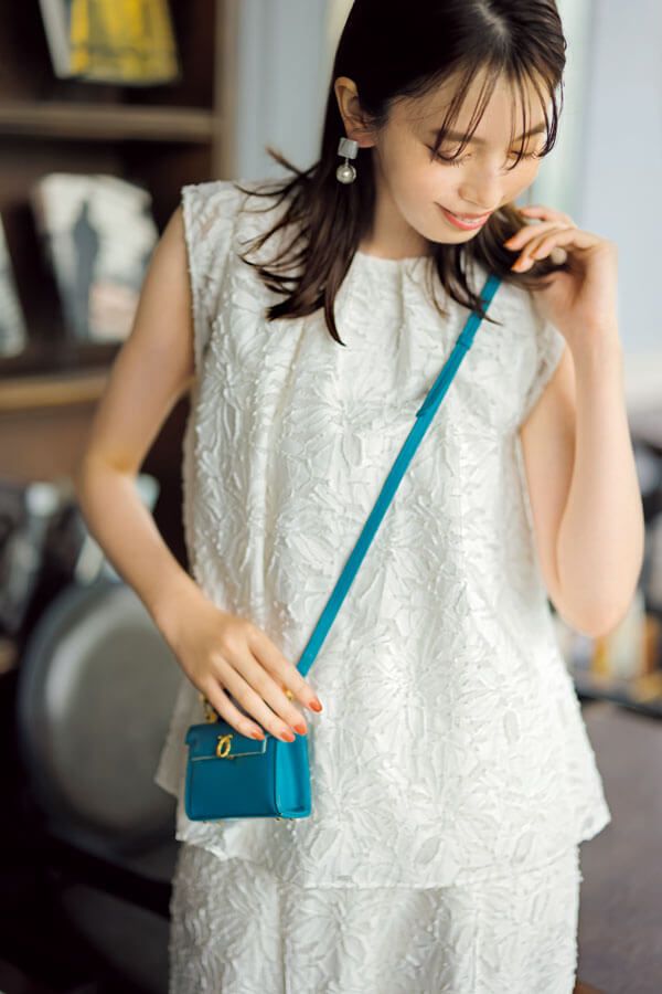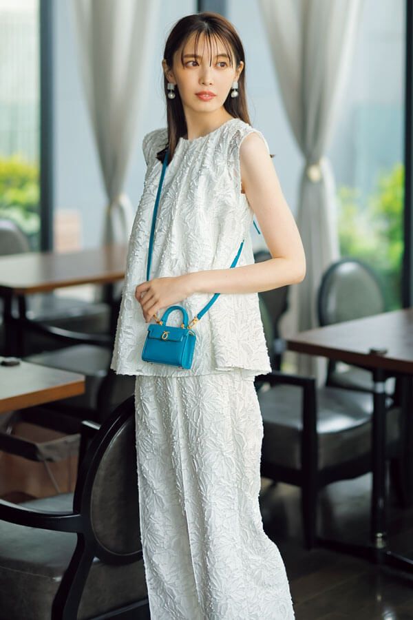 ブラウス¥17,600、パンツ¥20,900/ともにCELFORD イヤリング¥9,900/アビステ バッグ¥242,000/ロウナー ロンドン(H.I.T) 靴¥18,150/ダイアナ(ダイアナ 銀座本店)