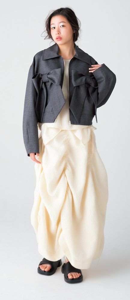 ワーク感あふれるデザインのジャケットにリボンをのせることで、ロマンティックなムードをプラス。落ち着いたカラーなので、大胆なデザインながらも、いろいろなアイテムと合わせやすい。オーバーシルエットや短めの丈感など、バランスよく着られるさまざまなエッセンスがちりばめられている。ジャケット¥86,900(メイメイジェイ/エスケーシー TEL:06・6245・3171) トップス¥63,800 スカート¥85,800(共にシーニューヨーク/ブランドニュース TEL:03・6421・0870)