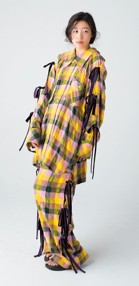 ウールとキュプラを使ったチェック柄のアイテムを、ベロア素材の光沢あるリボンや、ピンクやイエローのポップなカラーで、チャーミングに仕上げた。リラクシーなオーバーサイズシルエットや大きな襟もかわいい。シャツとパンツはセットアップで着るのはもちろんのこと、一枚でも抜群の存在感です。シャツ¥96,800 パンツ¥81,400(共にベースマーク/エム TEL:03・6721・0406) サンダル¥10,780(ペイズ/ジャーナル スタンダード レリューム ルミネ新宿店 TEL:03・5909・4675)