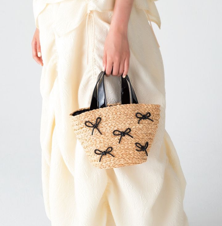 夏に活躍するカゴバッグに5つのリボンをオン。チュール素材のインナーバッグ付きで、中身が隠れるのも嬉しい。W30.2×H18.4×マチ11.1cm¥8,250(レイ ビームス/レイ ビームス 新宿 TEL:03・5368・2191)