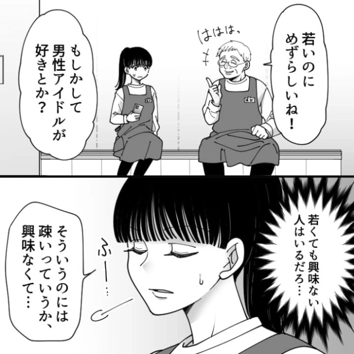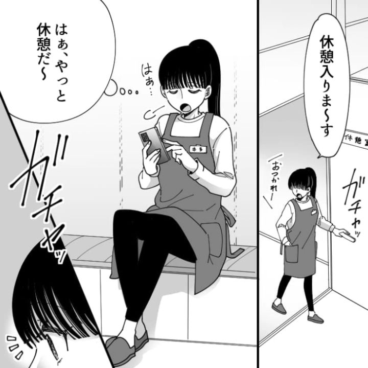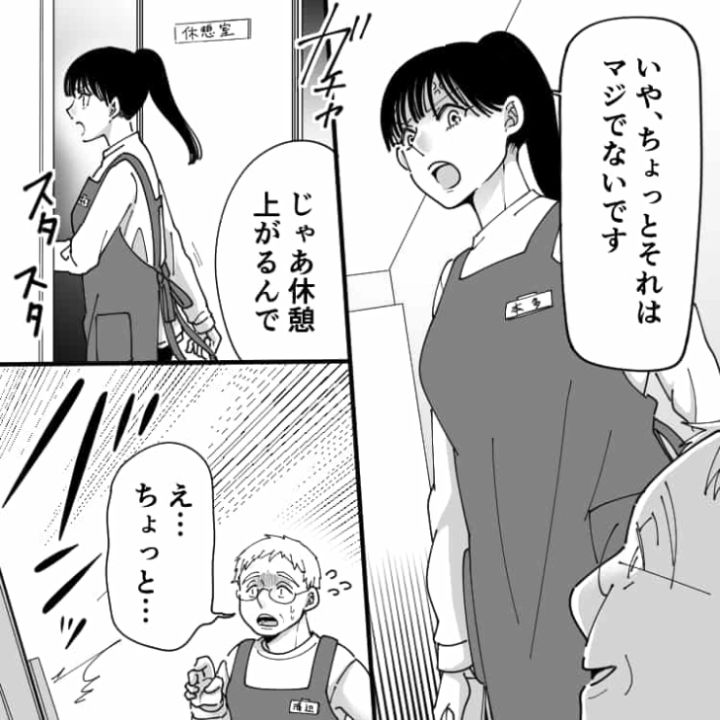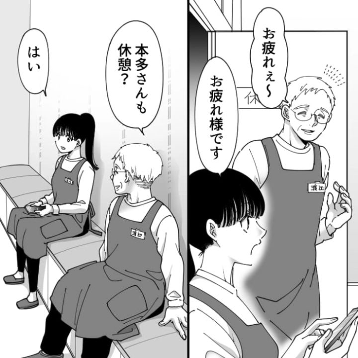 スーパーマーケットでフリーターをしている主人公。ようやく休憩に入り一息つくところに同僚のおじさんが入ってきて・・・。