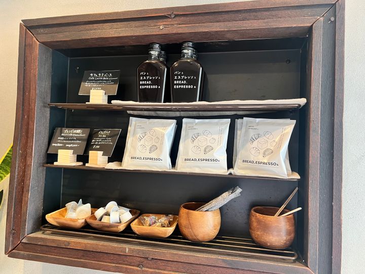 店内の棚にて、カフェラテベースやドリップコーヒーも販売中。