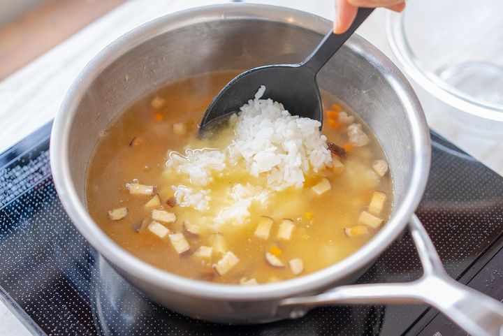 3. Aを入れて混ぜ、ひと煮立ちしたらごはんを入れて弱火にする。水分が少なくなり、ごはんがやわらかくなるまで10〜15分ほど煮る。