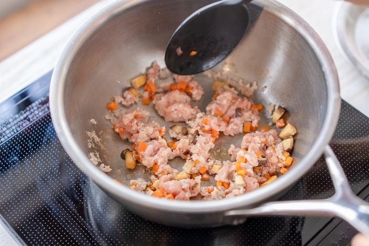 2. 鍋にごま油を中火で熱し、にんじん、しいたけを入れて炒め、油がまわってきたら、ひき肉を入れて炒め合わせる。