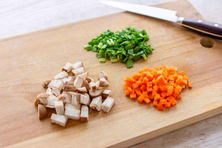 1. にんじん、しいたけは5mm角に、ニラは5mm幅に切る。