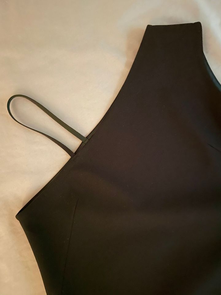 「一枚で主役になる今季らしいアシンメトリーなワンショルダードレスはカレンソロジーのもの。一枚で着るとエレガントな印象なので、パンツを重ねてカジュアルダウンさせました。足元はリラックス感のあるベージュのメッシュミュールでオールブラックスタイルにヌケ感を」