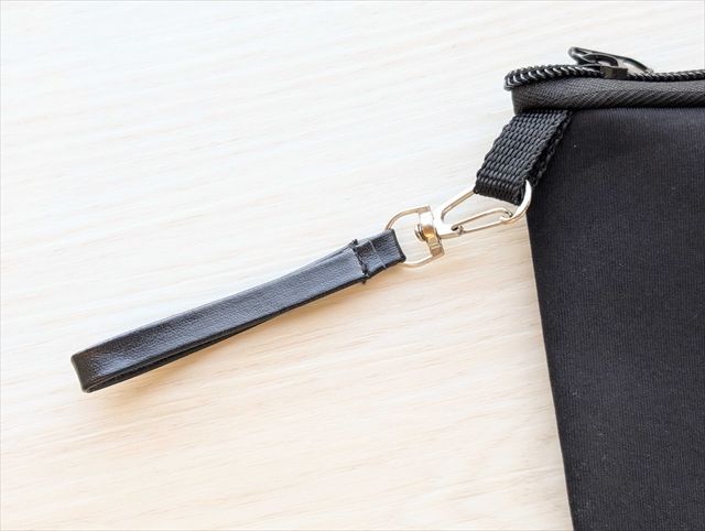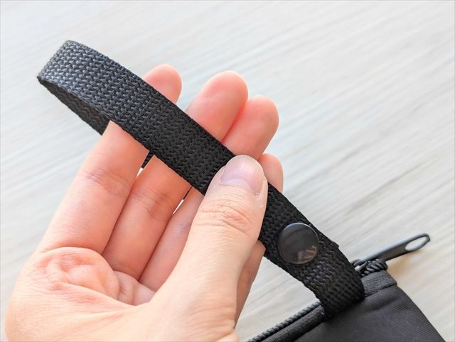 ボタンタイプのストラップがついており、持ち手としての利用だけでなく、腕や鞄に通すこともできます。