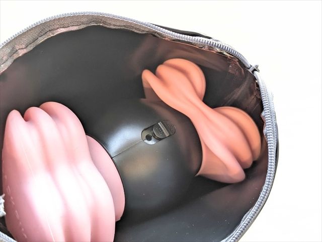 全体の厚みとしては約9cmありますが、ピンクのハンマー部分がゴム製で収縮するため、かなりぴったりなものの入れることができました。プラスチック製の黒い球体部分の厚さは約7cmあり、ひっかかかることなく収まっているので7cm以内であればケースに入りそうです。