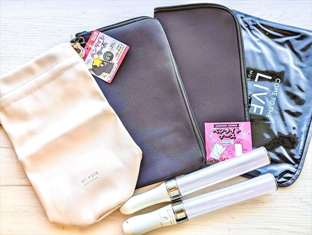 100円ショップの商品と比べると価格は上がりますが、どの大きさのペンライトにも対応でき、ショルダーポーチとして活用できる点としてはかなりコスパのよい商品だなと感じました。一方で、ペンライトケースとして鞄に入れるには生地の厚みもあるためかなりかさばってしまうので、荷物をコンパクトにまとめたい方はショルダーポーチとして使用することをおすすめします。