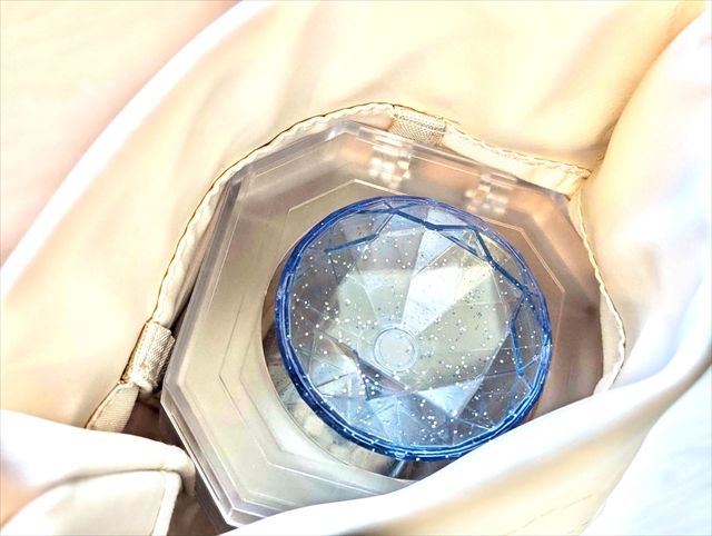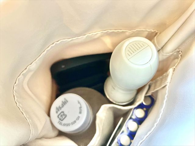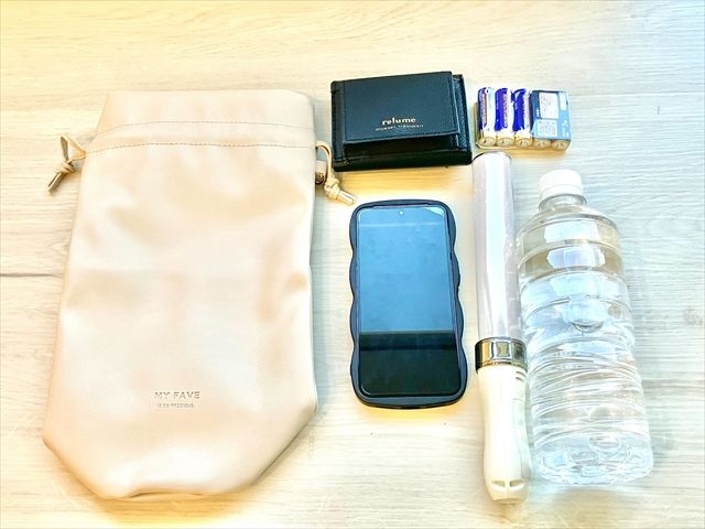 スティック状のペンライト1本に対し、600mlのペットボトル、財布、スマートフォン(6.2インチ)が入りました。スタンディングのライブだとロッカーやクロークに荷物を預け、最低限の持ち物で入場することもあるため、貴重品やドリンクを一緒に持っていけるのはポイントが高いですね。