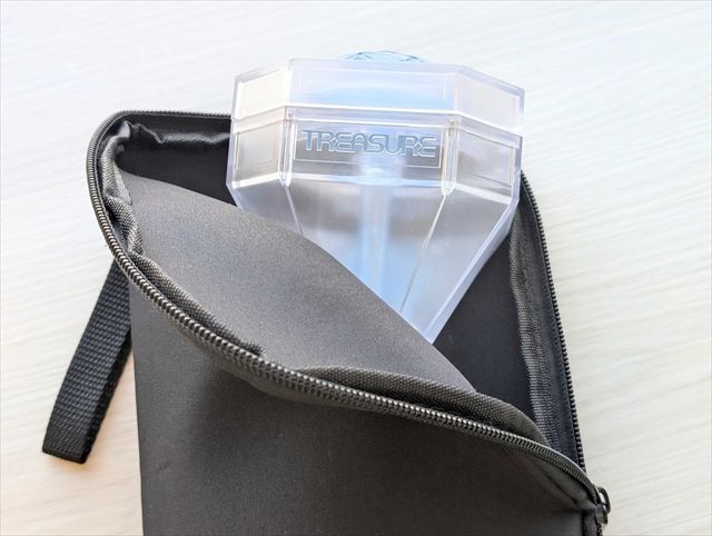 厚さが約9cmあるこちらのペンライトは、長さや横幅は問題なく入りましたが、画像のような状態でチャックを全て閉めることはできませんでした。