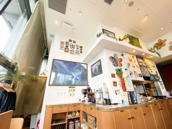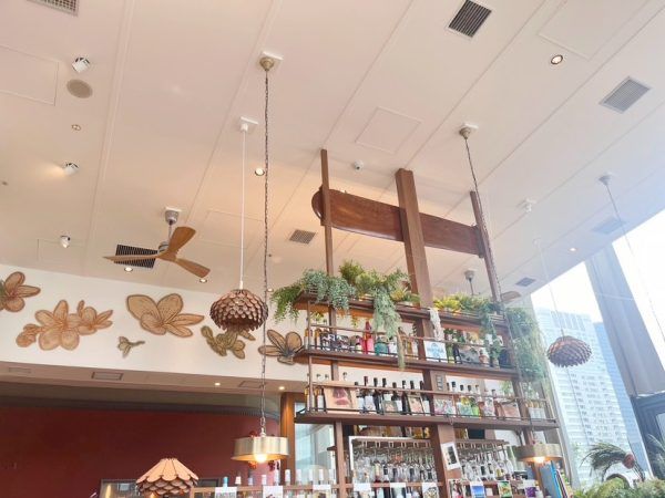 店内は、とても明るい雰囲気でした。壁にかかった装飾はハワイから直送しているとのことです!!テーブル席・椅子席・バーカウンターがあり、東京の景色を眺めながら食事を楽しむことができます。ベビーカーでの来店や離乳食持ち込みもOKです(※子ども用椅子はないのでご注意を)。