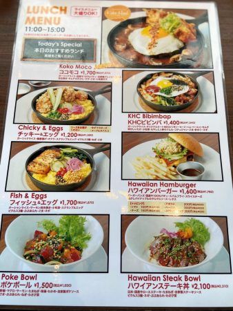 ランチは11時~16時までいただくことができます。メニューは、ココモコ・ハワイアンバーガー・ハワイアンステーキ丼等でした。平日は、サラダとドリンクも付いてきますよ。みなさんはどの料理をいただいてみたいですか??