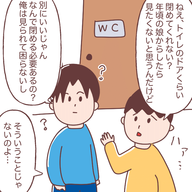 「ねぇ、トイレのドアくらい閉めてくれない?年頃の娘からしたら見たくないと思うんだけど」