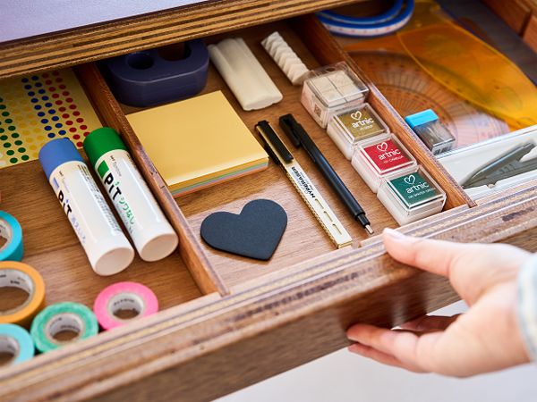 大きなロール用紙は、老若男女誰もが自由に表現をたのしめる試し書きの空間。引き出しにはマスキングテープ、シール、ふせん、はさみ、のりなどあらゆる文房具が入っているので、さらに自由に“書く・描く”を通じた表現をすることができます。もちろんすべて自由に使えます。