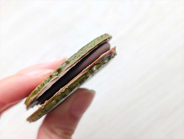 食感もクッキーのサクサク感と、キャラメルチョコレートのむぎゅっとしたねっとり感が同時に楽しめます。もう1枚……と手を伸ばしたくなりつつも、1枚ずつ大切に食べたい贅沢な味わいです。抹茶好きの方に1度は食べて頂きたい一品。