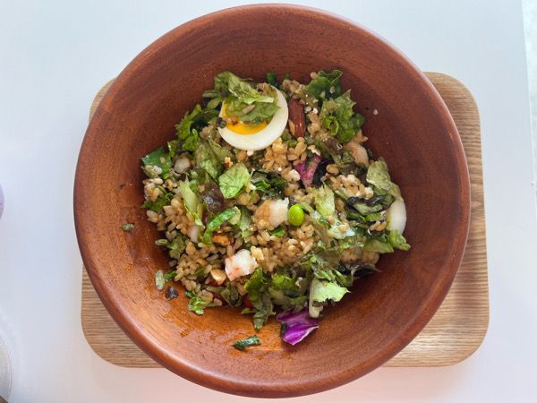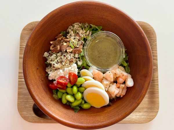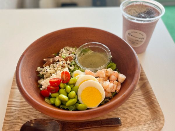 私が今回いただいたのは「シュリンプボウル」(1180円)。土台はグレインミックス、ドレッシングはハニーレモンをチョイスしました。グレインミックスは、玄米・もち麦・スーパー大麦の3種類の穀物がミックスされており、白米に比べ、食物繊維が多く、低GI食材であるため、ダイエットにぴったりな食材だそうです! ナッツ、ゆで卵、その他野菜などもたくさんで、ビタミンやミネラルを1つのボウルでしっかり摂ることができるのはとても嬉しいですね☆