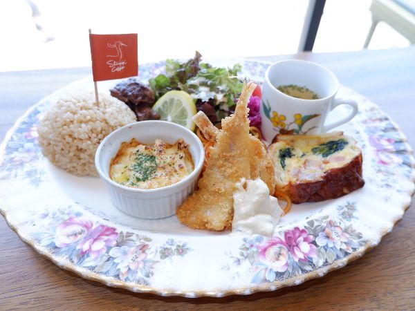 とくに、野菜たっぷりのキッシュが絶品で、贅沢なステーキが魅力です。ライスに刺さっている旗は白鷺をモチーフにしたデザインで素敵ですね。